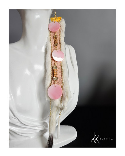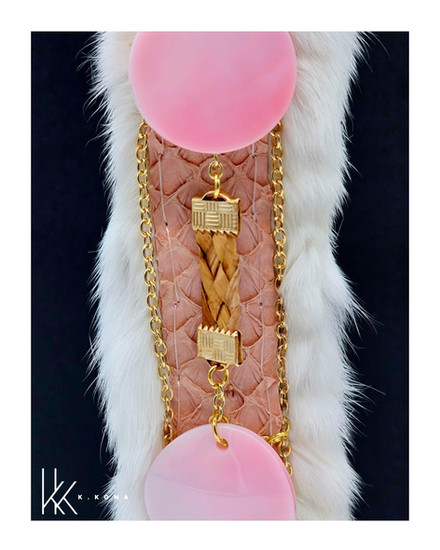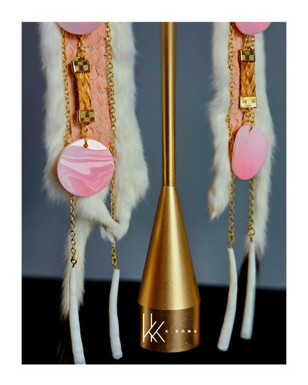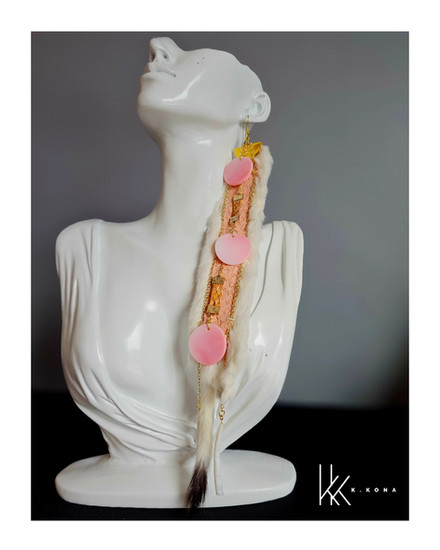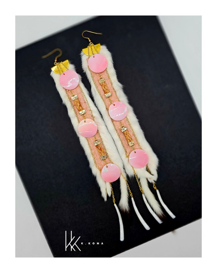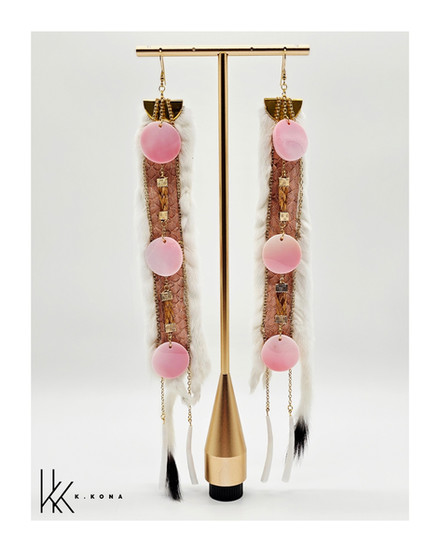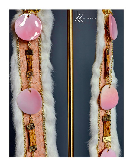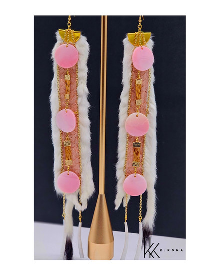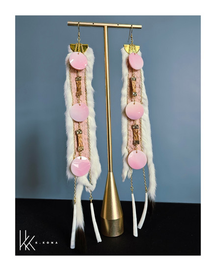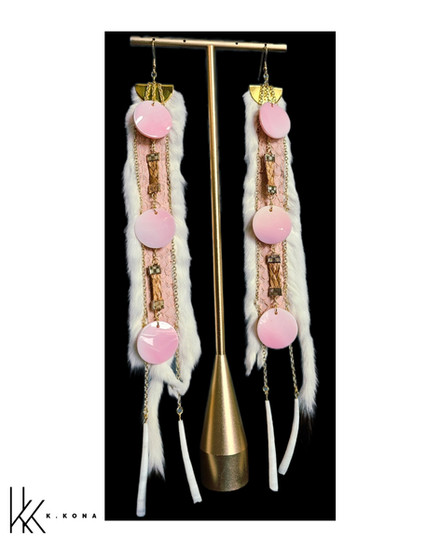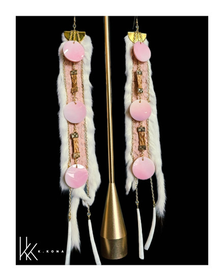 This pair was thoughtfully handcrafted using pink salmon skin leather, hand-sewn into ermine, with woven cedar throughout the design. I’ve also incorporated conch shells and gold chains that lead down to dentalium shells, creating movement and honoring materials that carry both cultural and natural significance. Every element is chosen with intention, blending tradition, storytelling, and contemporary design.
